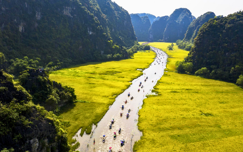 In the afternoon: The car will take you to Trang An wharf, take a boat to visit Trang An Eco-tourism Area. This is a place recognized by UNESCO as a World Natural Heritage with a system of vivid stalactite caves and a rich ecosystem.